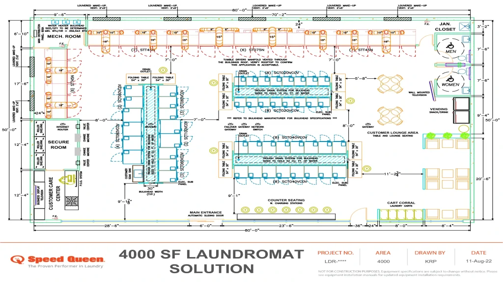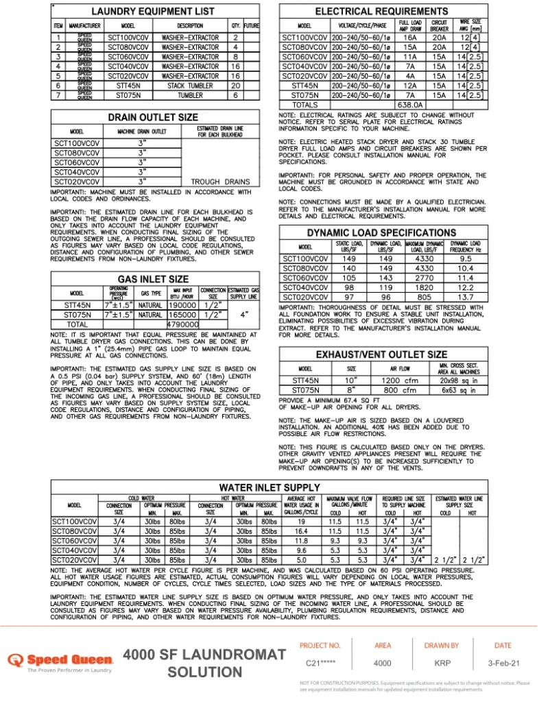 Details make the difference, and our Construction Drawing will assist any architect, engineer or design/build professional in preparing permits and drawings quickly and accurately. This package includes four paper copies that detail such information as equipment elevations, foundation specifications, and utility requirements for the laundry equipment to be installed. These files can also be emailed in .pdf, .dwg or .dxf file formats. With this information in hand, your architect or design professional can reduce their turnaround time significantly, which, in turn, saves you time and money.